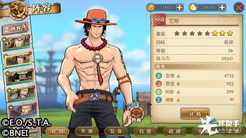在游戏中,艾斯是可作为前排的SSR角色,攻击属性与防御属性十分出色。艾斯的技能招式忠实还原动画,动态效果也十分震撼。培养前期,玩家可以体验主动技萤火·火达摩、火拳、镜火焰,终结技十字火以及奥义技大炎戒·炎帝。40级时可开启天赋技燃烧果实以及终结技炎戒·火柱,50级时将开启天赋技兄弟情深,与路飞同时上阵将提升艾斯的攻击力与防御力,非常值得期待。