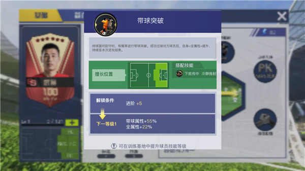 “带球突破”能提升带球属性,而且成功突破后还能大幅提升自身全属性: