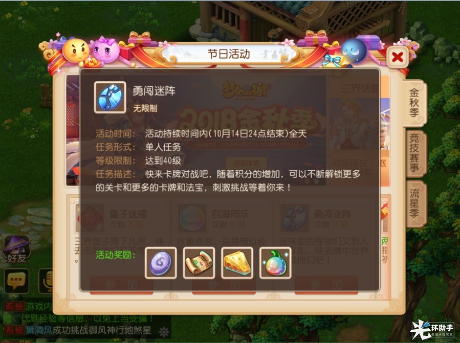 随着中秋国庆活动的开启,新一轮勇闯迷阵活动又来了,此次的勇闯迷阵活动与暑期活动不同,不是通过组建灵兽小分队进行对战,而是新形式:卡牌对战。随着积分的增加,可以不断解锁更多的关卡和更多的卡牌和法宝。