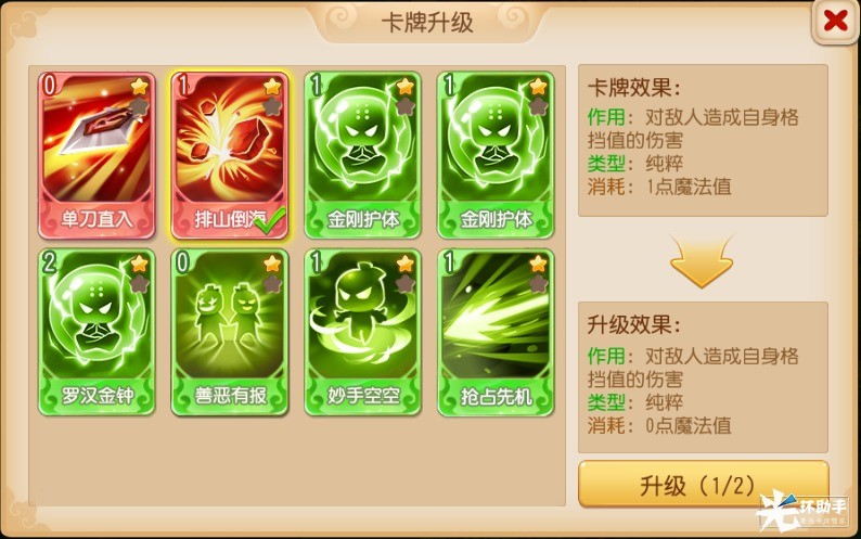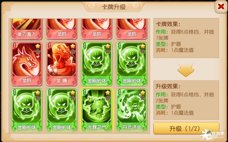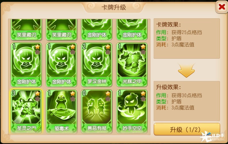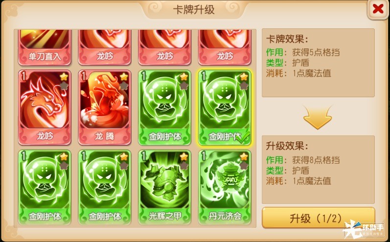 护盾攻击,主要通过使用护盾卡牌,配合功能卡牌和纯粹卡牌的使用,既能给自身增加格挡,又能给对方造成伤害,进可攻退可守,一箭双雕,是一种保守型的玩法。随着积分的增加,还可以不断解锁更多的关卡和更多的卡牌和法宝,例如使格挡翻倍的卡牌壁垒。(只可惜小编还没解锁出来,只能慢慢刷积分了)