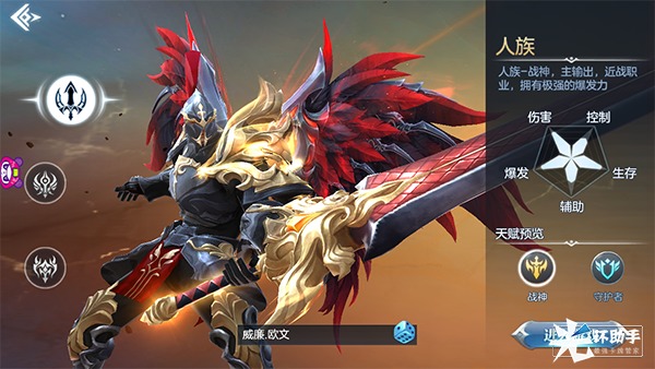 定位为防御生存类职业(类似魔兽中的战士),属于近战职业,整体输出均衡。人族分两个天赋方向——战神、守护者。勇士们可以根据自己的需求向着其中一个方向自由成长!