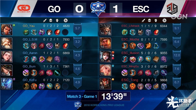 两分钟之前,双方没有发生团战,2分35秒,GO小乔被ESC抓住机会,ESC这边拿到一血。4分50秒,ESC拆掉GO上路一塔。6分30秒,GO战队拉扯开暴君,被李元芳成功收掉。8分钟,双方人头1:1,经济相差无几。9分10秒,GO牛魔闪现大起ESC张飞,配合闪现小乔带走了ESC张飞。GO顺势拿下第一条主宰。11分15秒,ESC老夫子大招绑住GO战队关键C位,ESC零换五挽回经济经济劣势,黑暗暴君也被ESC成功收掉。13分31秒,GO典韦下路被ESC三人配合击杀。游戏来到15分钟,双方人头比3:3,GO战队领先1000经济。15分20秒,GO牛魔空大,ESC抓住机会,想一波GO战队,千钧一发之际,GO战队全员复活,GO白起将兵线卡在水晶外面,极限守住水晶。此后,双方展开拉锯战,19分,GO全员五人进攻ESC上路高地,没有攻下。21分,ESC老夫子下路带线牵扯GO,GO无奈回城回放。最后一波,ESC苏烈大起三人,小乔自杀金身被ESC老夫子击杀,ESC取得比赛胜利。