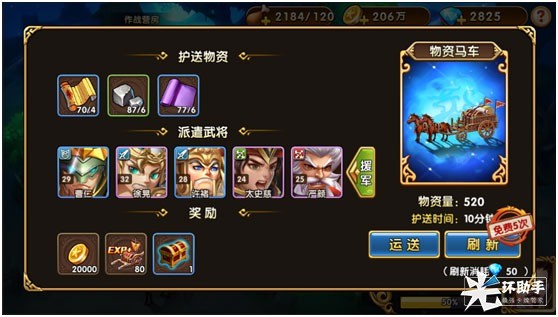 说到护送物资,可别忘了派遣上武将。不派遣武将护送的马车,轻易就会被洗劫一空。如果担心自己实力不足,可以多加好友,抱抱大神们的大腿,邀请帮忙护送。不过每名好友每天仅能被邀请一次,所以这个机会还是等刷新出高级马车时再用上吧,低级马车完全可以靠自身实力去护送。