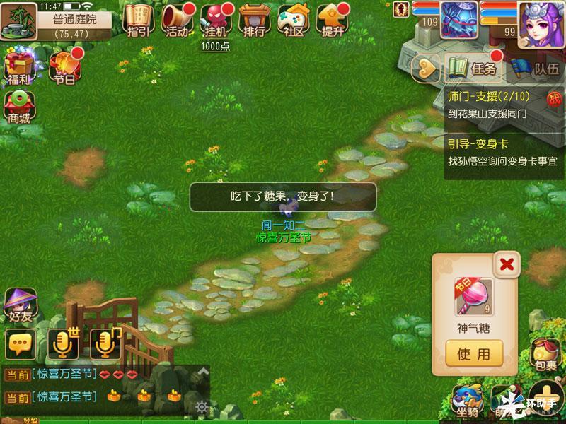 逐家逐户索取糖果,是万圣节经典的节日习俗。活动期间,玩家每天都可以找5个场景中的NPC对话,答对他们的问题即可索取糖果。除此之外,参与师门任务、捉鬼任务、日常副本、秘境降妖玩法时,也有机会获得糖果。每获得一颗糖果,个人空间的糖罐中便会自动加入一颗神气糖。