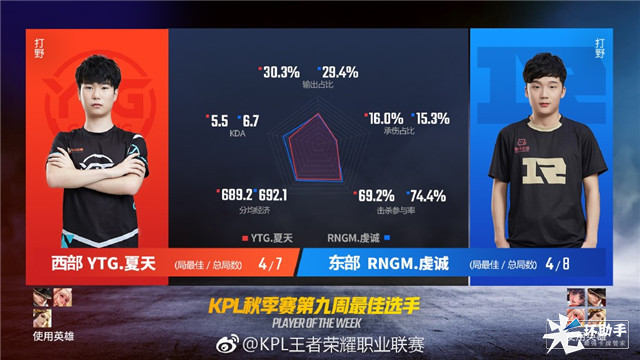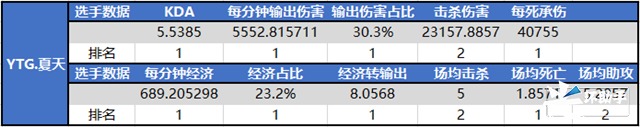 继第八周夏天使用孙尚香一举刷新KPL输出占比纪录后,本周的他依旧延续了出色的发挥,在11项数据上均位于西部打野中领先位置。从输出占比和经济占比来看,目前夏天无疑是YTG的绝对核心,当夏天在场上缺少声音丧失节奏后,整个队伍也很难取得胜利。而YTG也在确定夏天核心地位后,在团队资源倾斜以及打法上做出了不少的调整,从而让队伍在场上运转更加顺畅。
