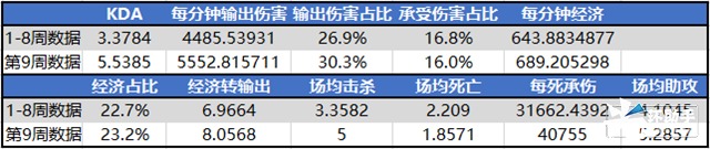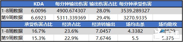 两名选手本周的数据与之前相比均有了大范围的提升,其中共同点在于伤害制造能力以及找机会能力明显提升,同时团战中规避伤害做得足够出色。但在经济获取上两名选手出现一定数据上的差异,也印证了打法风格上的对比,虔诚的经济占比反而相较于前几周有小范围下降,整体RNG.M在打法上对于虔诚的战术安排更倾向于团队中的收割位,而非夏天较大比重的输出位,也是两支队伍在战术需求和场上具体安排的不同点。