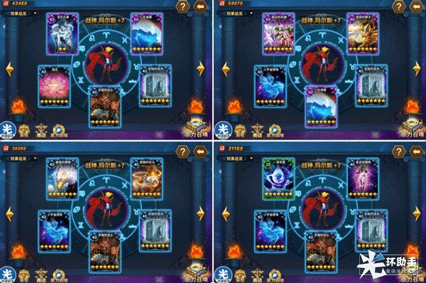 第二种是偏输出的合,“隐忍的风暴”、“易怒的狮子”、“水瓶座宝瓶”等等后排输出加成的卡都可以给战神佩戴,如下图所示。