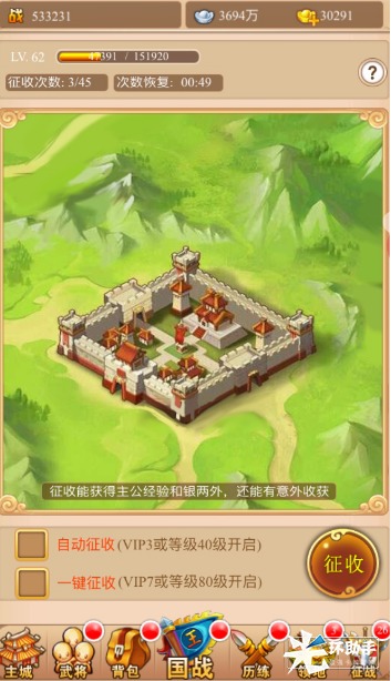 领地:领地征收能获得经验、银两以及其他的道具奖励。等级越高征收次数也越多,每五分钟恢复一次征收次数,当征收次数满了以后将不在累积,此外还可以购买征收药水,一个征收药水可以增加十次征收机会,然后VIP等级越高,可购买的征收药水也越多。不缺钱的主公,可以尝试这个方法。