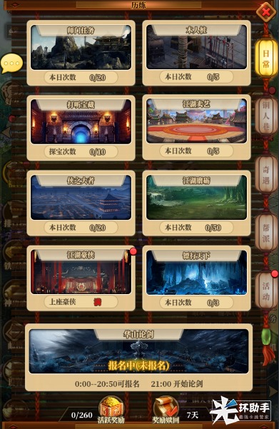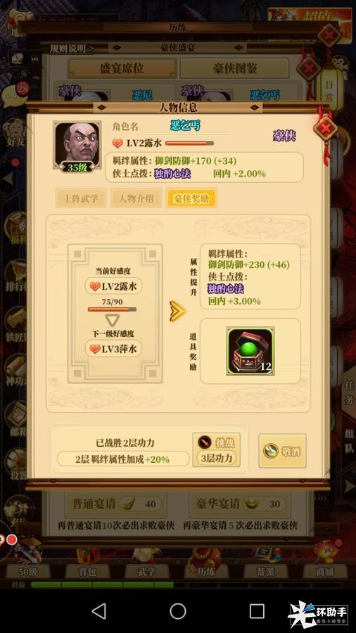 豪侠玩法于35级开启,通过历练界面进入,侠士每天可以在「江湖豪侠」中挑战各大豪侠以及对他们敬酒。挑战成功可以提升属性值,敬酒则可以提升好感度,好感度提升到一定值后会升级羁绊等级,同时获得羁绊属性加成、武学威力提升以及丰厚的道具奖励。