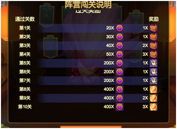2、 阵营闯关:每次过关都会获得奖励,关卡越高获得的奖励道具就会越丰富,每轮闯关5次机会翻牌翻到通关卡牌进入下一关提高vip等级可以增加翻牌数。第一次翻牌免费过关后翻拍一次消耗8元宝往后轮数依次叠加2个元宝。翻牌奖励如下: