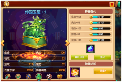 3. 神器:31级解锁神器,龙泉宝剑解锁条件为主角等级达到28级、山河令解锁条件为主角等级达到38级、七星长明灯解锁条件为主角等级达到45级、传国玉玺解锁条件为主角等级达到58级或者vip10解锁、禹皇沉鼎解锁条件为主角等级68级解锁。神器进阶的基本条件是神器的每个加成属性点数必须大于等于5级。神器强化的数值随机而定,强化的数值越大进阶的等级越高武将的战力就越高。