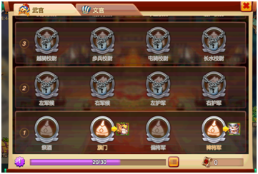 4. 官职:36级解锁官职系统,通过使用丹书铁券来启动官职称位任命已拥有武将使其武将获得属性加成,越往上的官职启动条件越高。生命属性或者物防属性、法防属性等为武将加取防御类属性的官职可任命给前排主盾武将,物攻属性、法攻属性等为武将加取攻击类属性的官职可任命给后排输出武将。丹书铁券获得方法有四种南蛮入侵、讨伐、声望商店、元宝商店。