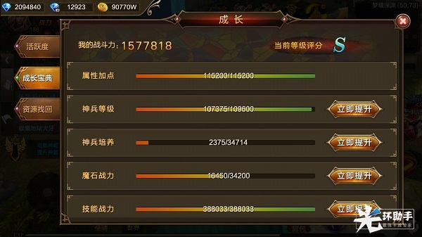 选择成长宝典可以看到玩家当前自己的战力值和等级评分,若当前评分较低可以根据下列战力进度表来安排,其中有属性加点、神兵等级、神兵培养、魔石战力、技能战力、魔戒等级、英灵羁绊、坐骑等级、坐骑皮肤等二十个方向供玩家分配资源提升战力。例如小雪在神兵培养方面还有很大空间,点击【立即提升】进入神兵系统界面,消耗对应的资源从而提升战力。