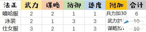 属性:2133,武力加1,共10点,3点速度和武力的加成对法正都是非常关键的属性,整体属性比较OK。