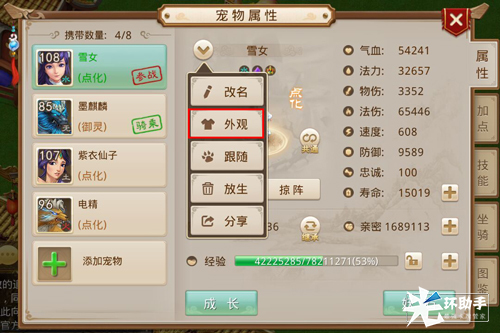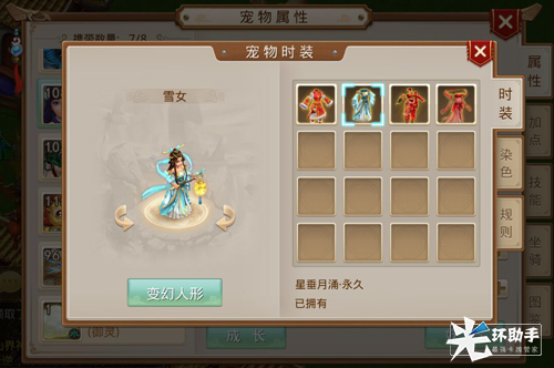 宠物时装并非简单地为宠物穿上衣服,而是与宠物共享角色时装,从而让宠物实现幻化。通过宠物属性界面上方按钮可进入外观界面。