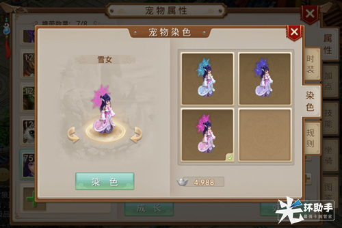 首批开放染色宠物有:金头陀、火鸦、电精、雪女、雷怪、云兽、金翅鸢、蝶仙、水魔神,每只宠物都有三套染色方案。比如下图的雪女,染个粉色是不是显得更加粉嫩可爱了呢?
