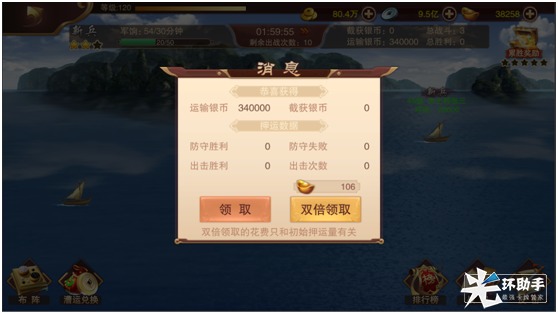 再谈最后的领取,有一个双倍领取功能,是需要消耗元宝的,但是消耗的元宝数量,其实是和玩家押运的银币数量相关,但是翻倍的收益,却把押运的银币和抢夺来的银币都翻倍,所以最佳的方案是押运2小时的船,在即将到岸前,一次性用完剩余的战斗次数,这时候再翻倍,性价比最高。