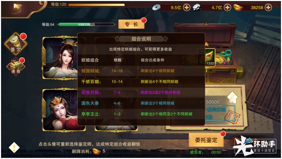 每次鉴定,都会随机出一个组合加成,高级加成是低级加成的十多倍,怎么用最小的代价,刷出最合适的组合,是玩家需要研究的策略。如果觉得刷新组合的价格太高,就可以选择“鉴定1个”进行鉴定,获得一次免费刷新的机会,同时还能重置刷新价格。