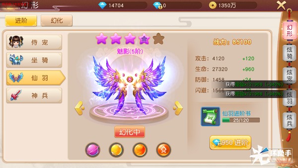 一共有5个阶级的仙羽,需要不断进阶激活。仙羽进阶需要仙羽成长书,进阶后可以提高仙羽的属性,仙羽最终增加的战斗力是进阶后所有数值的累加。