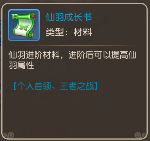 仙羽成长书可以通过挑战个人首领、王者之战获得。当仙羽成长书不足时,六阶以下的仙羽进阶可用钻石补充