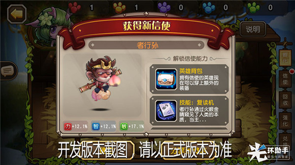 复读机:者行孙通过火眼金睛窥见了人类的本质,当主人剩余血量低于30%时,给主人恢复血量,并大幅增加魔抗。(一场战斗只能释放一次。)