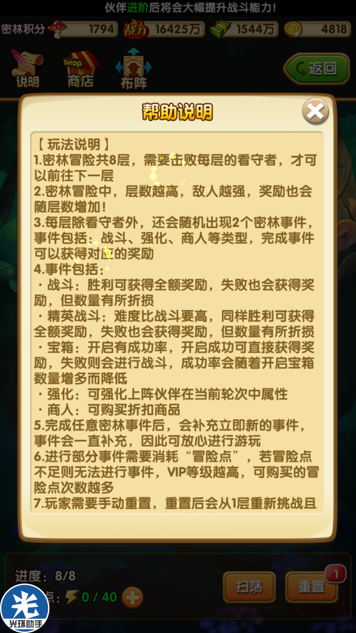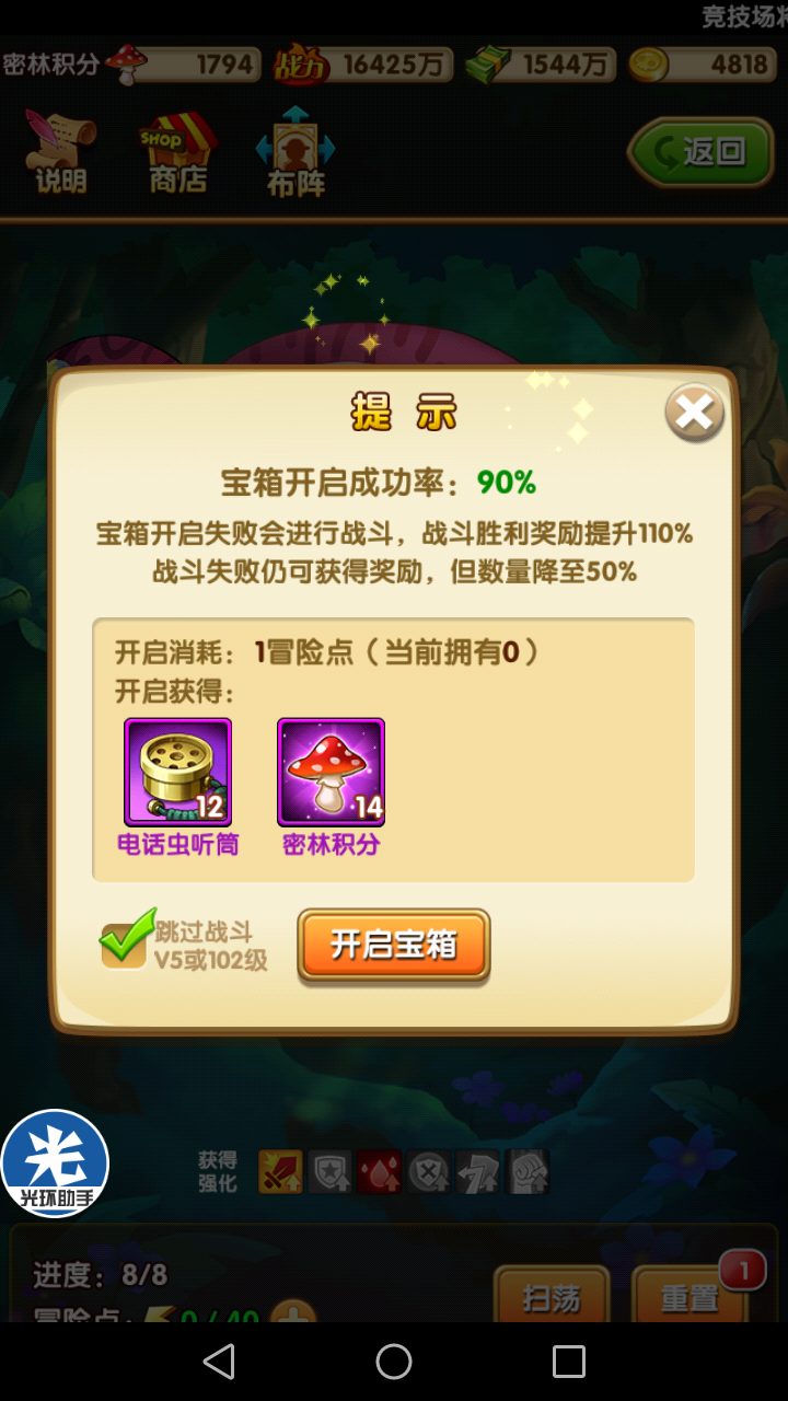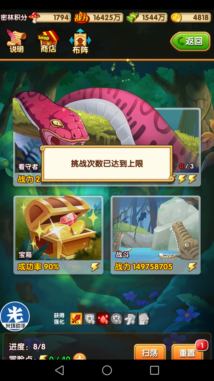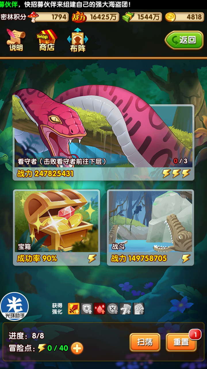 关于密林冒险,这个玩法默认玩家先手,通过pvp过关拿资源。优先打最上面的关卡,打到通关为止,第八关通关以后,就可以无脑刷下面的两个随机关卡了。优先打宝箱,其次是精英,最后才是普通的。
