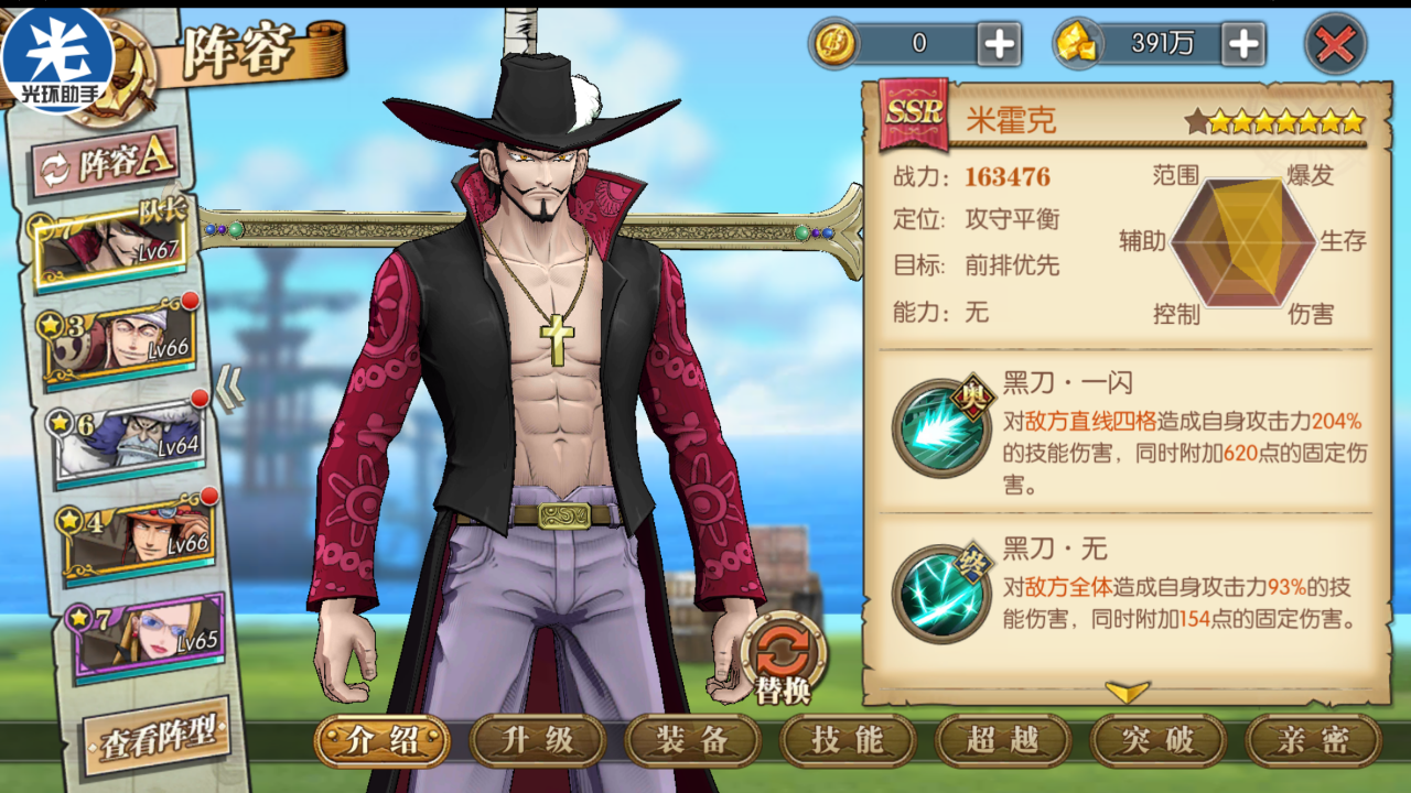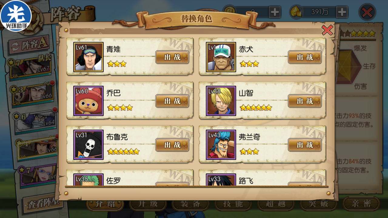 把雷神艾尼路换成六星的乌索普,阵容用闪避阵,前排放乌索普和吞吞,艾斯换成山治对位狼人封技,鹰眼带曙光加奥义输出,佳妮法回血辅助