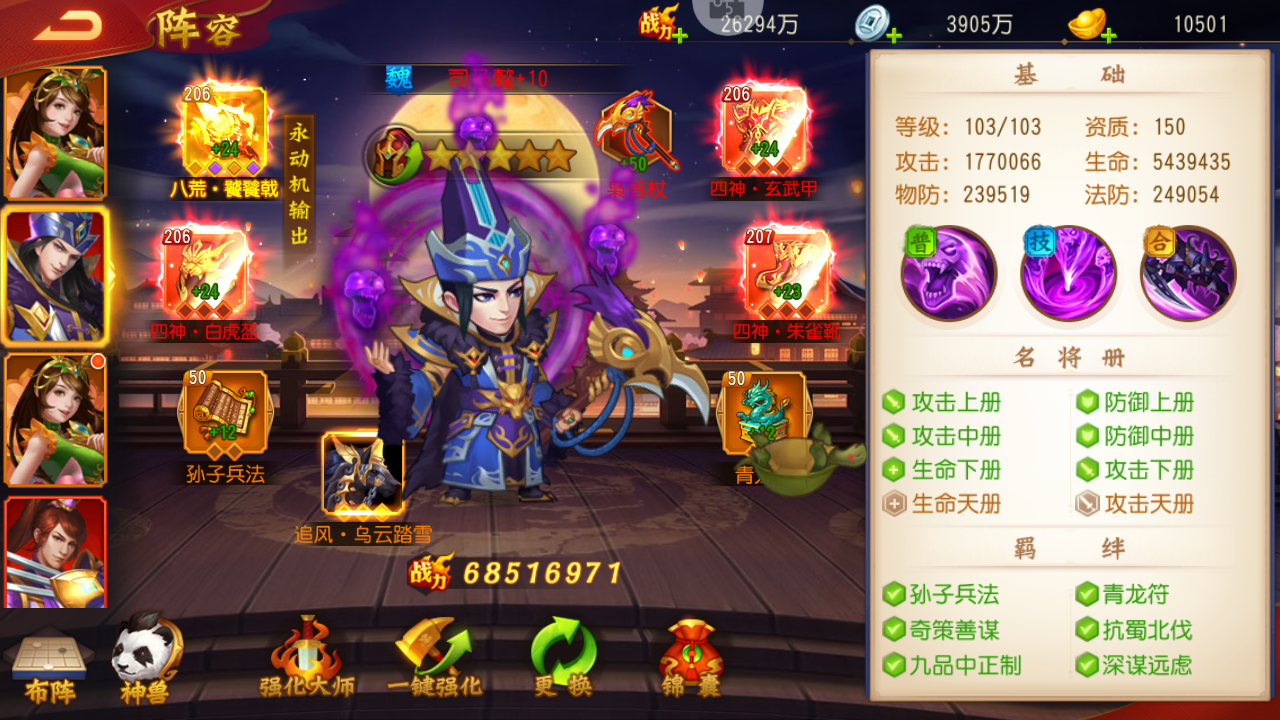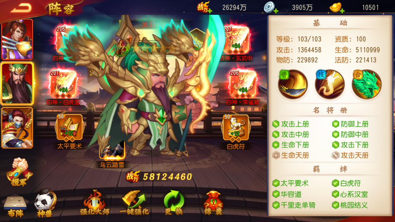 就推荐的那个阵,你先一步步把甄姬,荀彧换上去,夏侯比较耗资源,115后变身张飞,没资源都能克主极限甘宁,关羽等阵容。如果现在说防极限单体。你可以张合一号位给二号位司马懿上无敌盾,张合红后无敌给魏国将套上,被曹操锦囊驱散能加30%血,看你能抗住不,神兽你要加强下白虎,麒麟次之,青龙