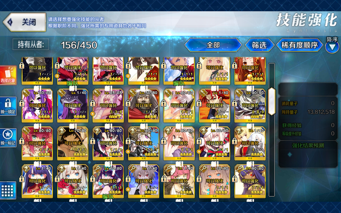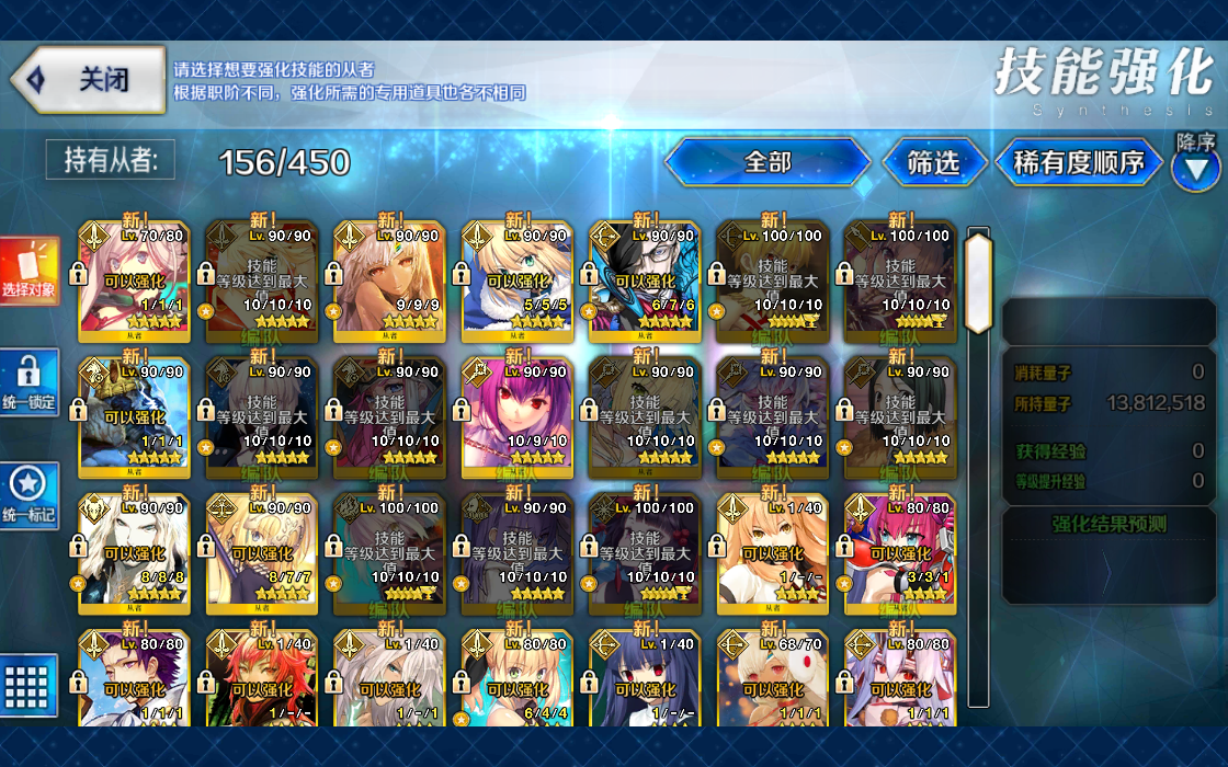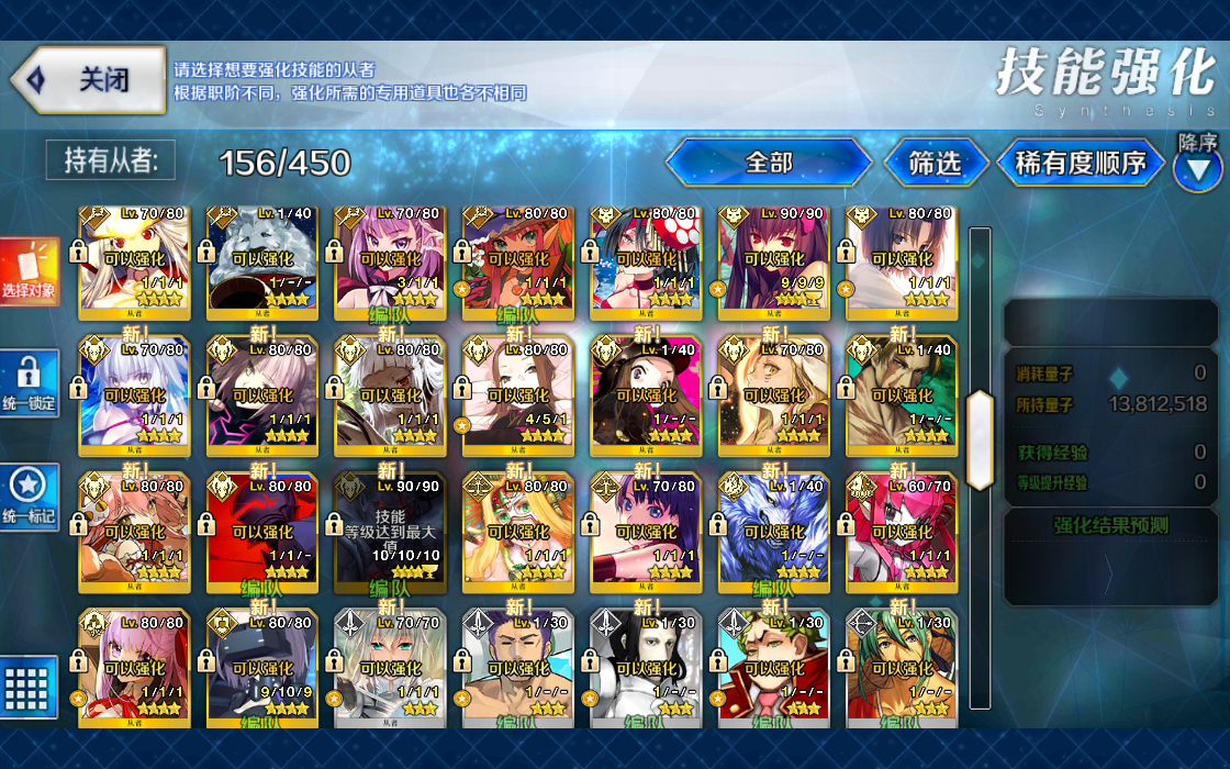 四拐不说,还有强力的打手,强力的打手包括每个职介,单体还有光炮都该有一个练度,而且每个定位下都有一个强力打手甚至多个。 对于新手优先度是光炮比单体优先,前期新手练单体从者反而没啥作用,刷狗粮,刷周回,刷主线本敌人血量都不高,单体发挥完全没有光炮好用。 特别是那些有自冲的光炮,前期队新手帮助特别大,如果是自冲又是强力的光炮那就属于前期必练,例如闪闪这个自冲光炮,泛用性高,强度强,而且材料前期可以获取,容易培养。 FGO角色强力太多,单纯数的话都不少于40个了,强力的从者差不多有50个左右了。 可以查节奏榜,一般节奏榜排名较前的那些打手都很强力,都很值得练。
