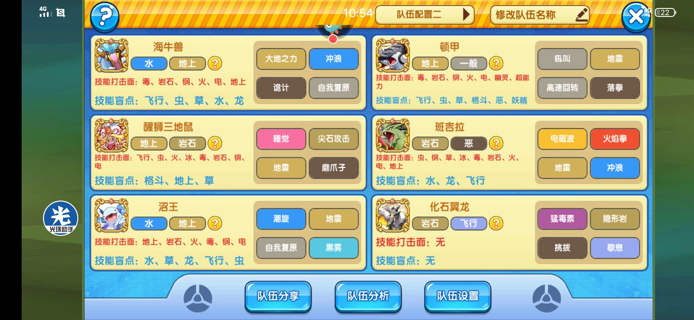 化石换成小陨星,遁甲换成桃幺幺。 队伍不是不行,就是综合的联防性和周转有点问题。 这里修改的意见就这两个。 和你说一下吧。 首先化石搭配地鼠意义不大,因为沙暴已经有班吉拉了, 不需要化石,而且队伍需要周转宠物搭配地鼠抓人,这里最强的就是盾牌的小陨星,不用走输出,直接极限物防就可以了,走落拳极速猛毒就可以了。 然后遁甲换掉,队伍只有一个海牛抗水,风险大,加多知道桃幺幺,加强地面的联防和水联防,效果会比较好用。 基本就是这样,你参考一下