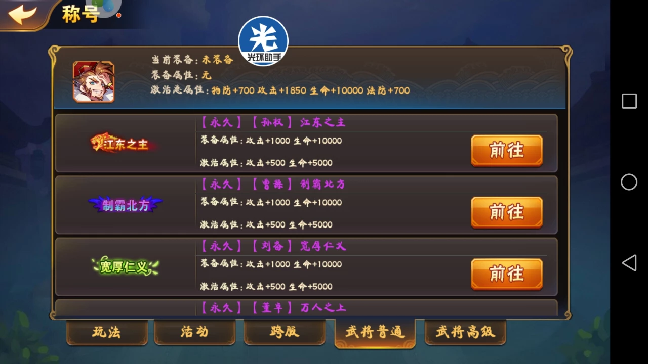 你发这几个称号是购买整套月基金送的,然后激活后不能改变,比如你激活了刘备的称号,激活的下排属性是全体的,这个一直有效,上排的主公称号属性是你要上阵刘备后刘备戴上去给自己加的属性。转国后称号不会转变。