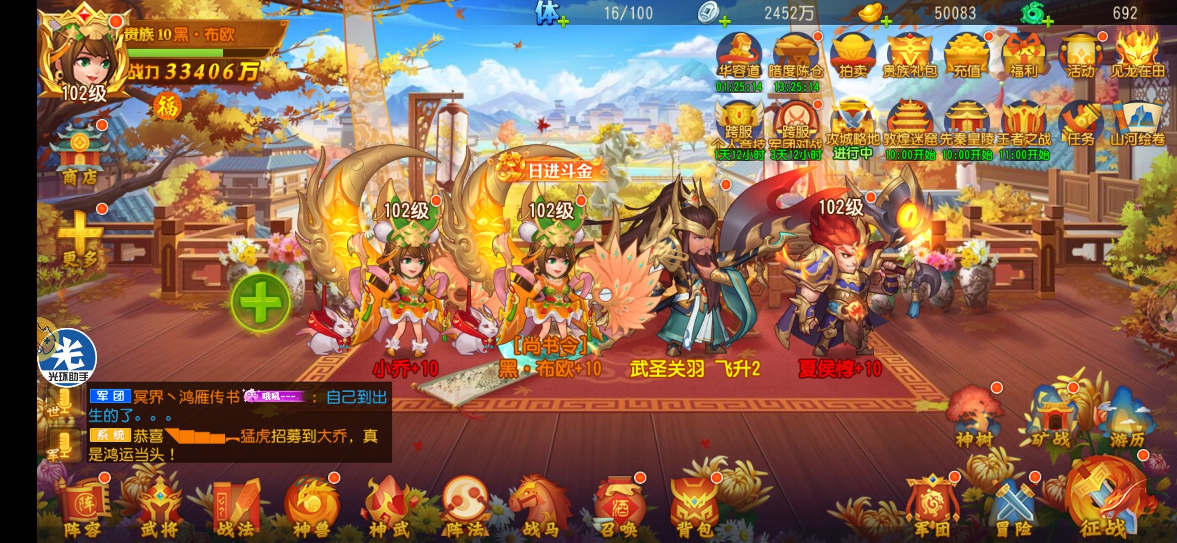 不要急,抗两个回合你关羽还没砍死他们,就不要怪夏侯了,那说明你关羽伤害也不行,才102级,加强关羽各方面输出强度,
