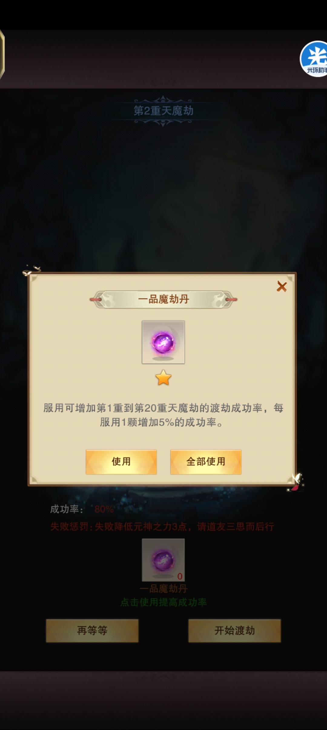 神界愿力司可以买丹方,不过前100重可以看你自己选择是否强渡,前期失败减的也比较少,刷魔劫丹材料也需要时间,而且魔劫丹丹方也需要愿力,每一品对应20重,后期的丹方一品对应十重可以自己看魔劫丹介绍。或者可以前60品强渡60-100吃丹,提前刷60-100的材料。