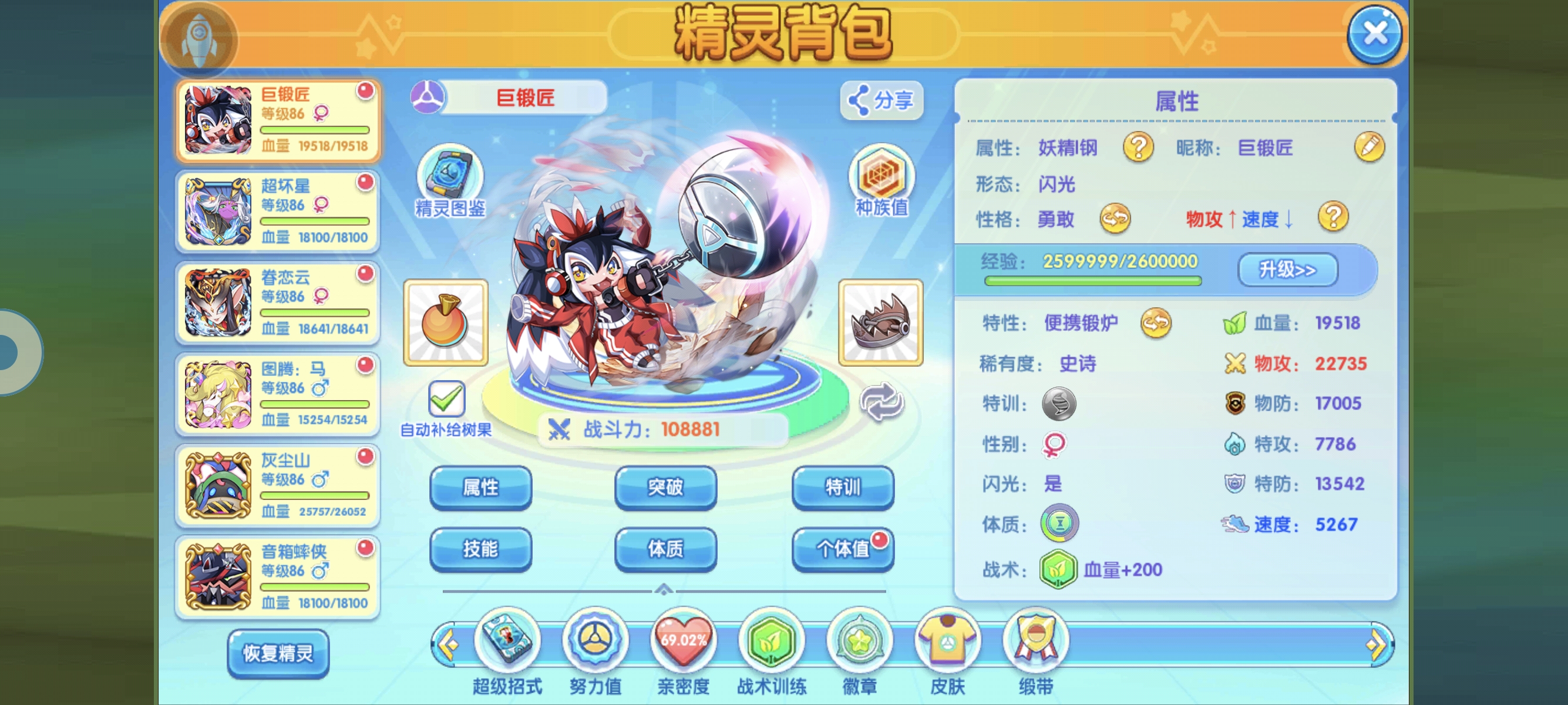 巨锻匠,眷恋云这两个可以考虑换了的,队伍缺极巨位可以去高级狩猎场捉帕路奇亚,然后特惠礼包的棒球手皮卡丘可以配合灰尘山,最后的音箱蟀侠可以换成恶食大王。