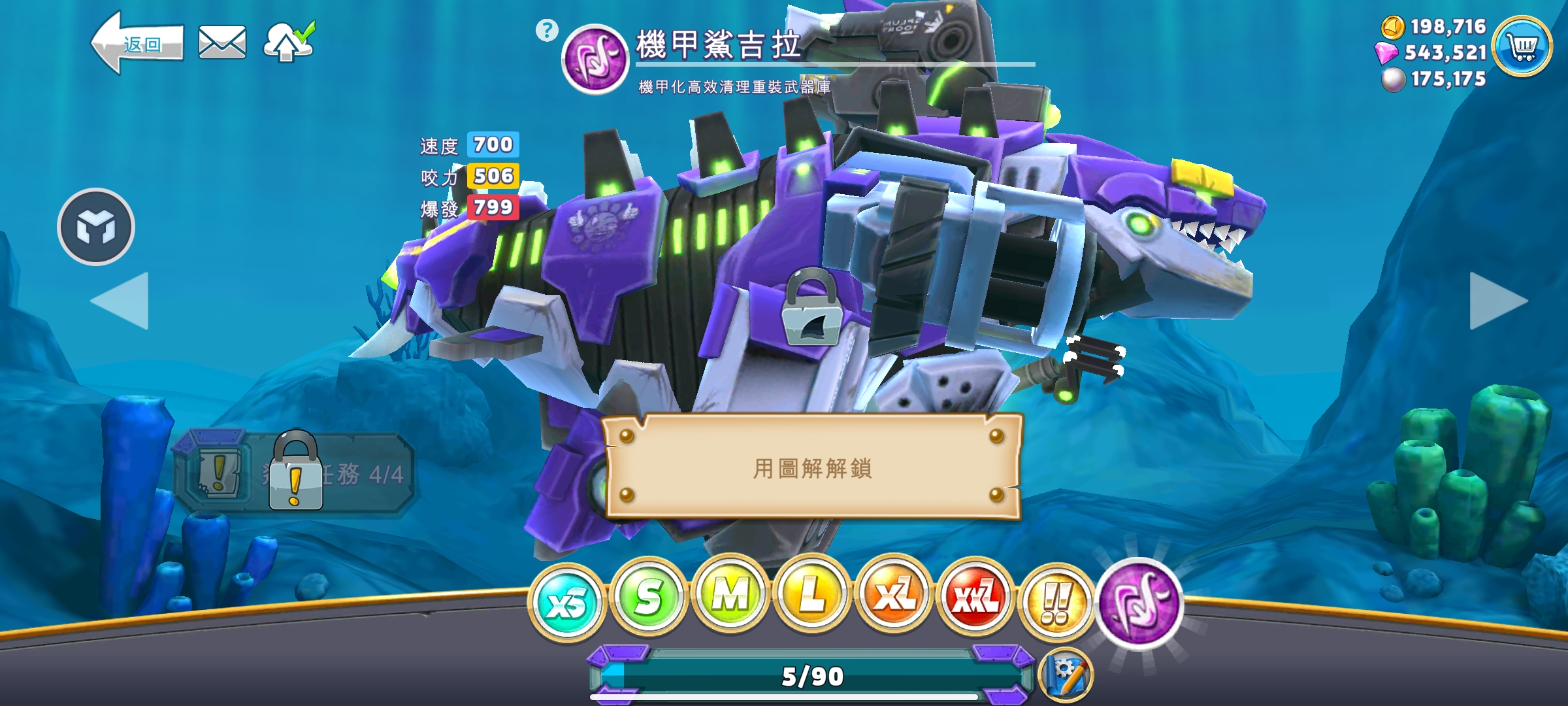 就是每个鲨鱼都会有五个任务在左边,这些任务可以直接用金币和钻石快速过掉,下面有个进度条呢,你完成多少多少鲨鱼任务之后会给你解锁什么机械哥斯拉啊什么的,不应该就是他说的圆,翻译出问题了