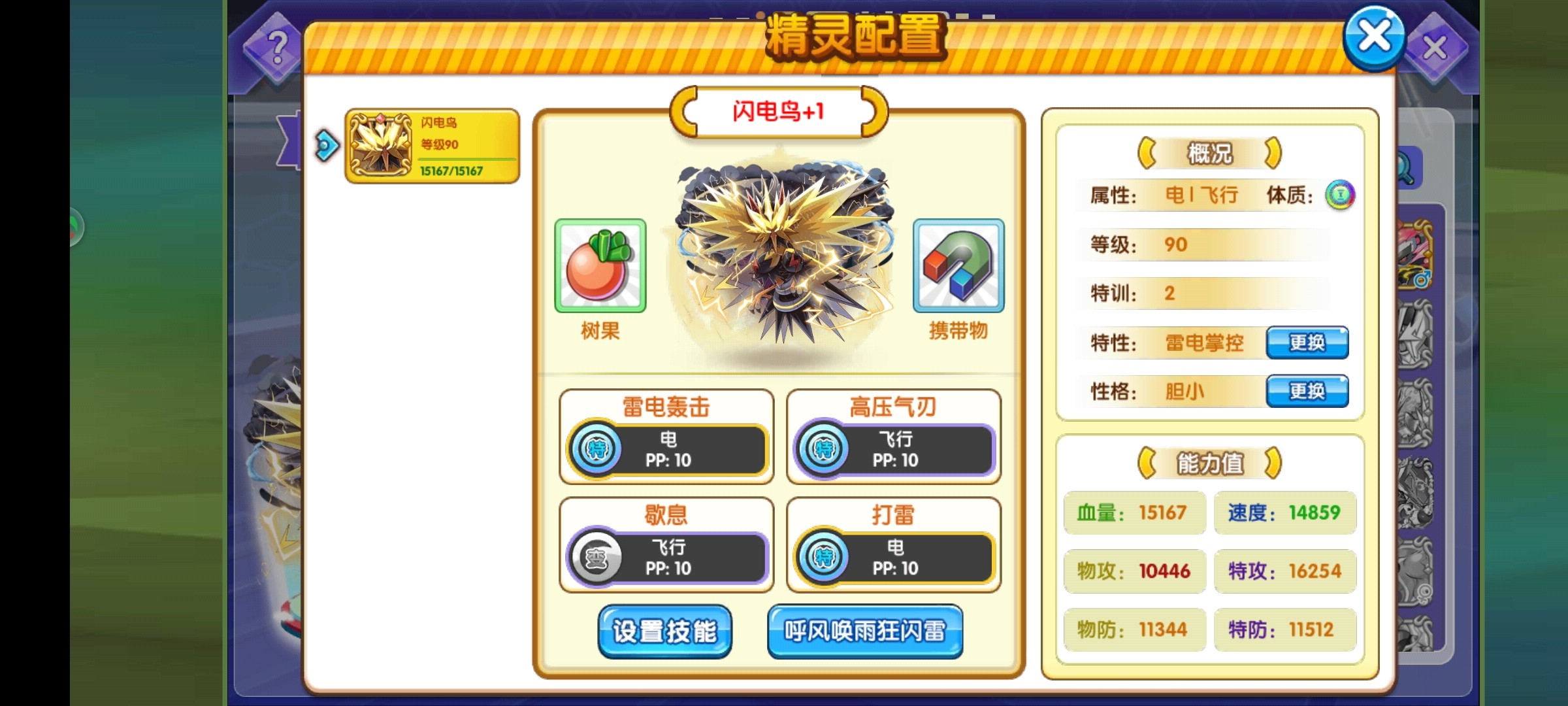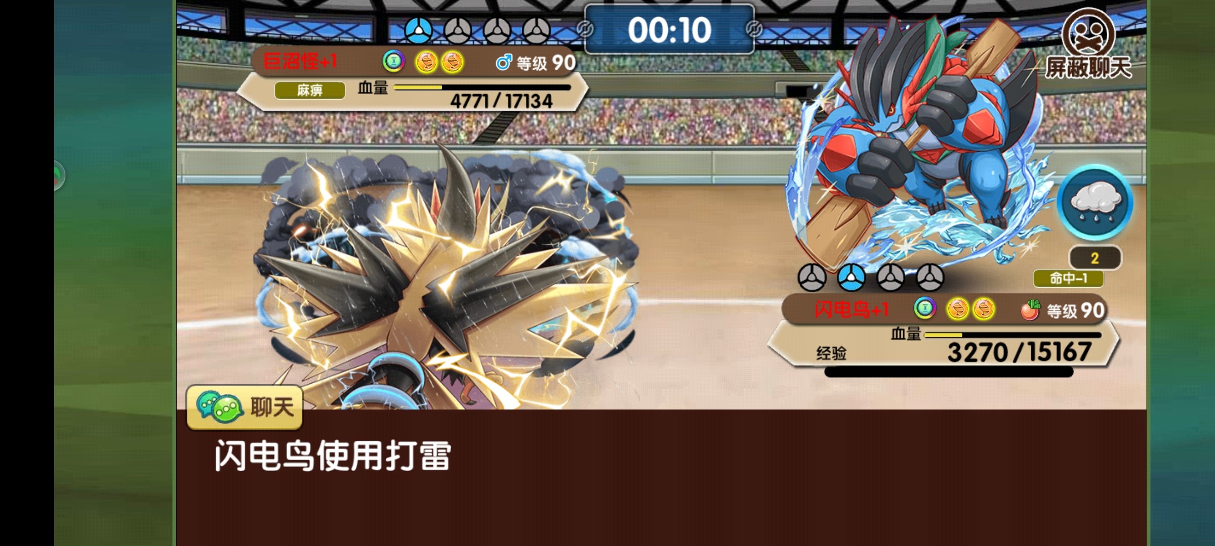 首波上去开始是逆风局,主要我用没怎么配的宠先送上去消耗对方,不过到后面,对方没禁我的主力满配闪电鸟,所以果断开大放天气,利用特性加成收割对方,获得胜利。