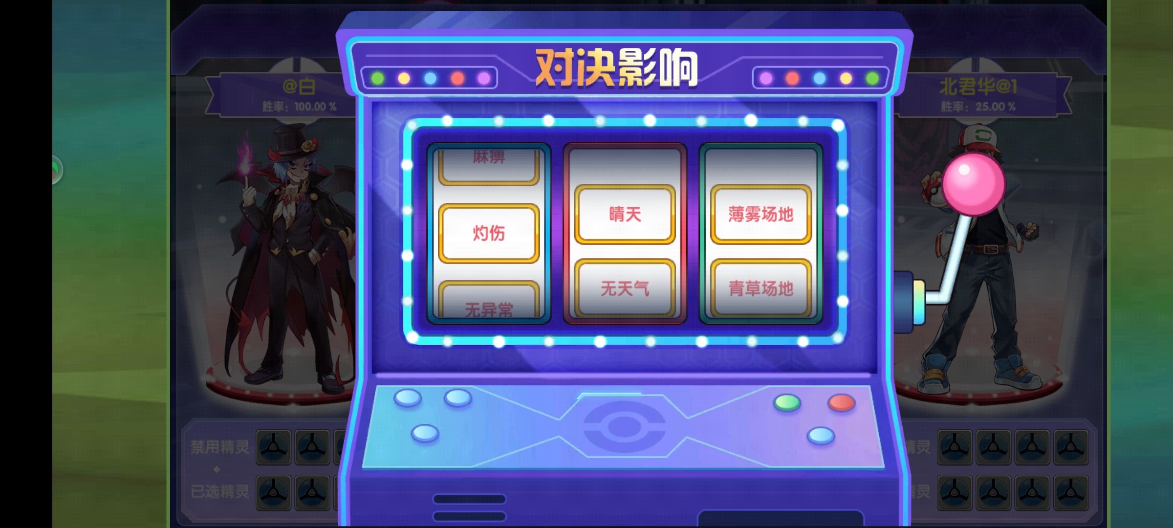 然后就到了对战,对战开始前先用随机转盘确定状态、天气、场地,所以个人建议,每个精灵都最好选择奇迹果,说不定遇到变态的状态,你上场就抵消了,但是对方没有,天气和场地,决定了你选择什么精灵,最好挑选有利于我方的,比如晴天我就用喷火龙,电气场地我就用闪电鸟,这都容易在对战中占据有利位置。