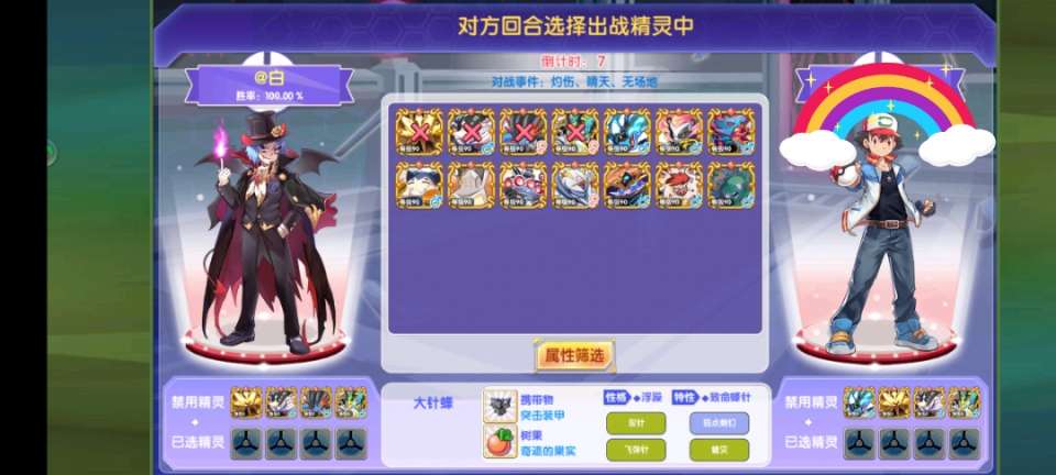 开局接着先是禁宠环节,个人建议先禁初始给的那些热门的,比如闪电鸟、巨沼怪之类,因为很多玩家都上去直接给初始给的精灵满配,结果后面发现积分不够了,你这样一禁,可能就把对方主力给禁了,而对方如果禁了你的主力也不用怕,前面不是说了吗?多配几个宠,不求满配,只把好用的技能给了,这样即便主力被禁,你其他宠依然比对方有优势。