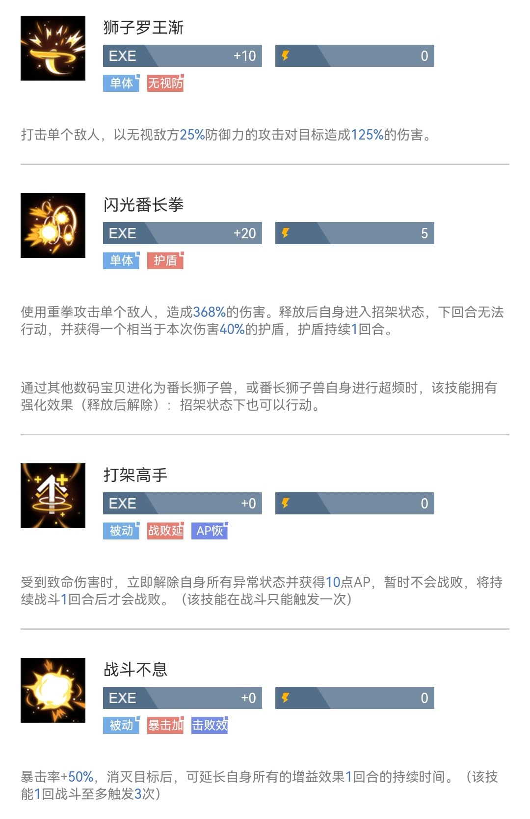 忠实地只为自己所坚信的「正义」而活的兽人型数码兽。只有与强大的对手战斗,没有让内心「屈折」并持续胜利的数码兽才能获得「番长」的称号,数码世界观测史上,拥有这个称号的数码兽被确认只有5位。番长狮子兽只贯彻自己的「正义」,如果成为其「正义」的障碍,就算是皇家骑士和三大天使也会被其认为是「恶」的存在,成为应该排除的敌人。肩上披着的外褂「校服(GAKU-RAN)」二.技能介绍:
