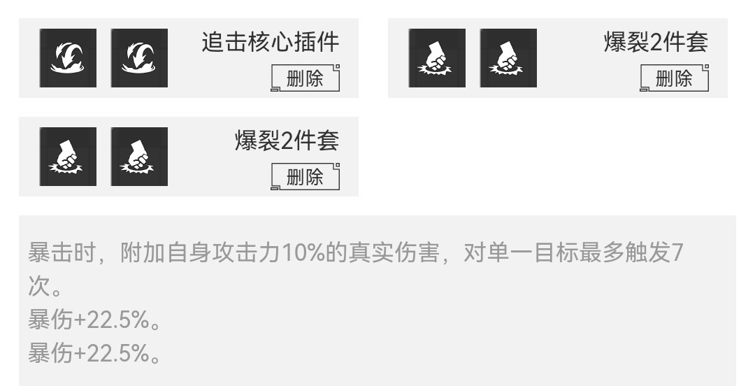 因为被动有50的暴击率加成,所以带暴击伤害加成最求极致伤害,核心插件追击可以触发奥义增加多段伤害。