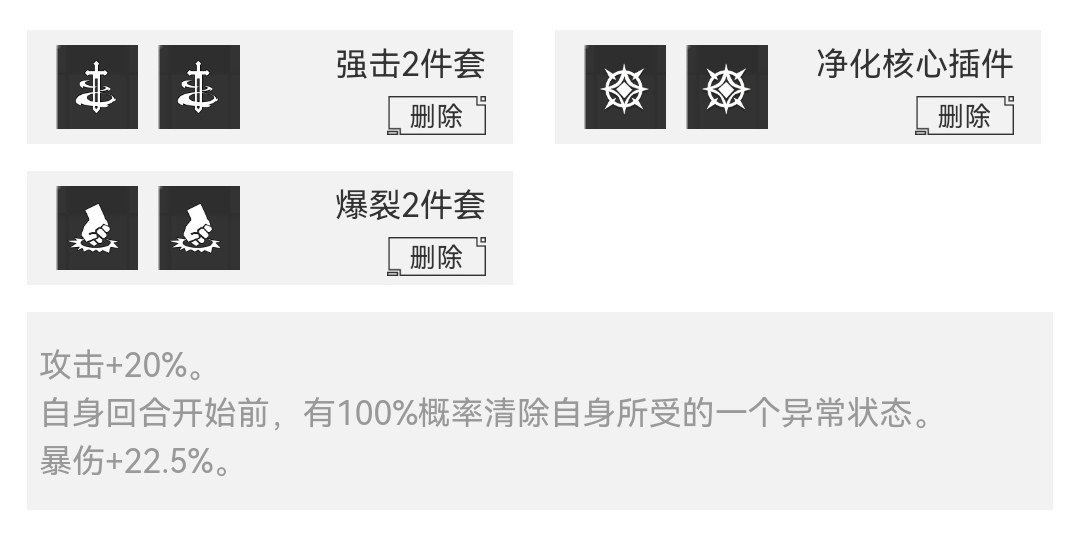 核心插件带净化插件其余带两爆裂2强击或者4爆裂,核心插件必须净化插件,可以解除因奥义带来的无法行动的副作用,简直为我们的狮子量身定做。