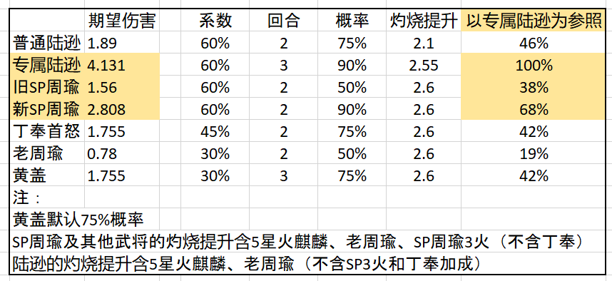 假定以上猜想是正确的 那么15%攻击的真伤 其实在现在版本 并不算特别高(潘凤一次怒攻都90%了)如果你的阵容是 SP、老周瑜、丁奉、徐盛、孙坚、凌统 再算上火麒麟 你的灼烧伤害提升已经有了50% 50% 60%(合计额外1.6)