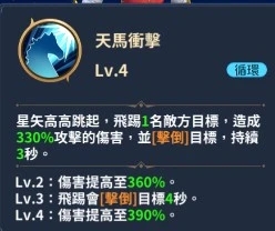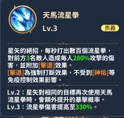 不再有合体技(毕竟还没有黄金白鸟)。数值与原本一样,毕竟游戏里所有奥义大招都只有三级。天马流星拳的数值加成在游戏里算是中规中矩的大招了,特点是击退是强制打断效果,还不错。