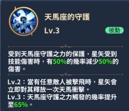 后两阶段的技能 是对生存能力的一个补充,所有伤害都会降低50%,防止残血暴毙。增加星矢的与奶的契合程度(雅典娜就算了基本上不了场),注意该技能不是持续buff而是触发性的buff,只有生命低于30%时才会所有技能伤害降低50%。