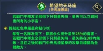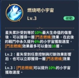 名字来头极大。小宇宙增加速度最高可加成100%。可以一直释放天马流星拳。不过需要配合回血技能,不然生命值直接下降100%触发10层,岂不是有命开,没命用。该技能需要搭配星座圣衣技能一起来看。星矢配合新的该被动以及圣衣星座技能一起,将其变成了残局战神,也完美还原了原著,笔者个人还是很喜欢的。