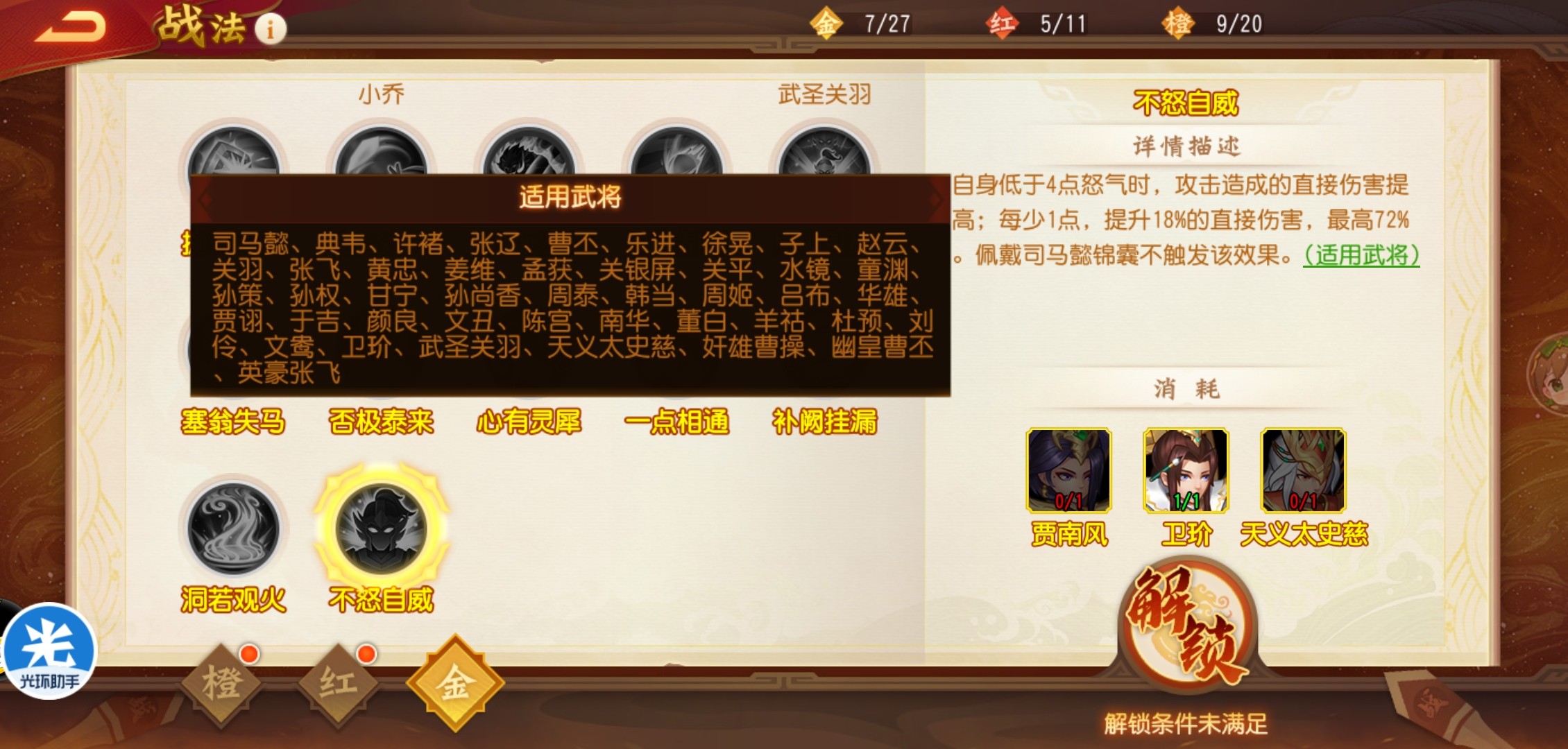 飞升1的汉张飞佩戴司马懿锦囊,释放技能前先损血回努,达到7点时触发司马懿锦囊,正常行动叠加伤害,如果损血也不够七点时,就不行动。