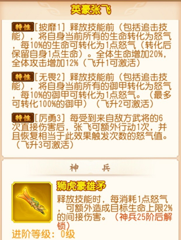 飞升1后,汉张飞损血恢复怒气,即便怒气为0,满血状态最高可以恢复10怒气,带来的直接伤害提高60%,额外造成目标生命上限20%的间接伤害。