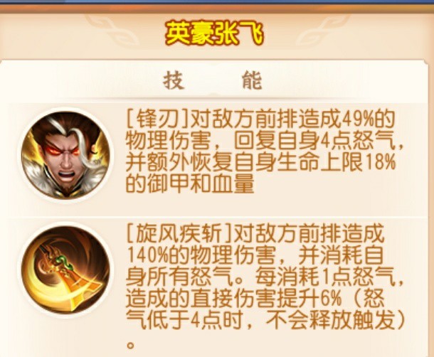 汉将张飞对比普通张飞,缺少了不屈,并且打破了普通张飞突十后不消耗怒气的特性。