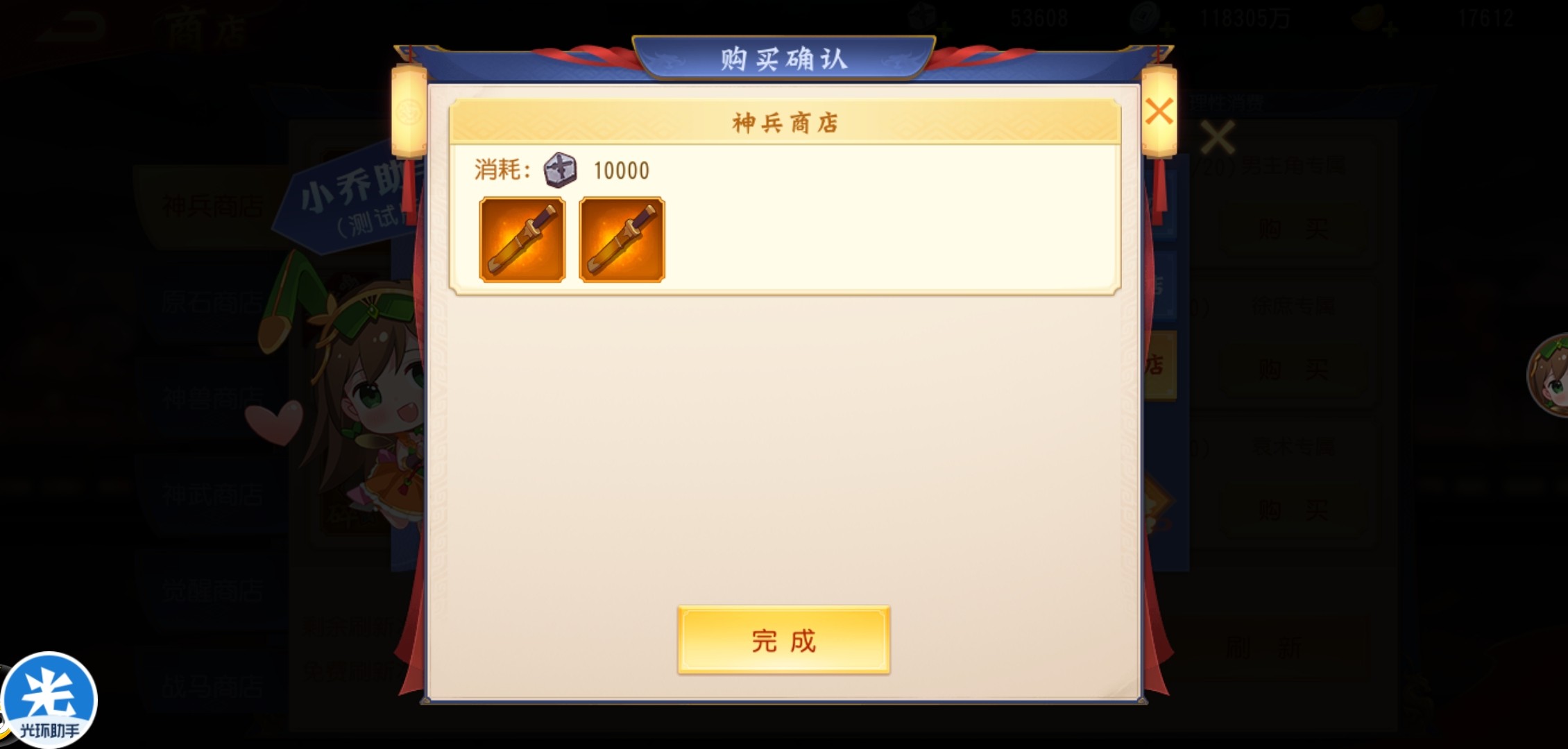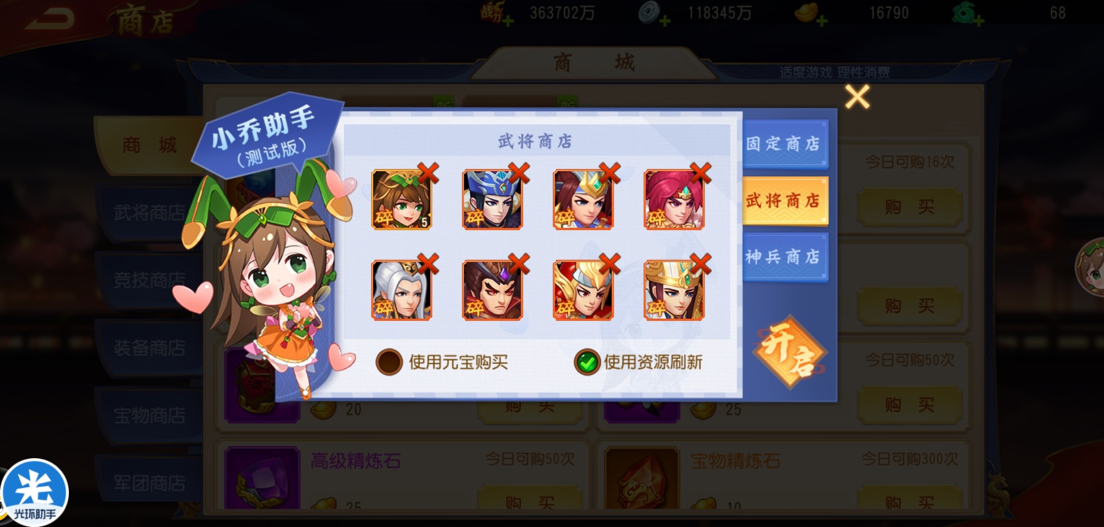 2、小乔助手增加一键扫货功能,主公点击商店后再点击小乔助手选择自动购买的物品点击开启即可自动扫货;