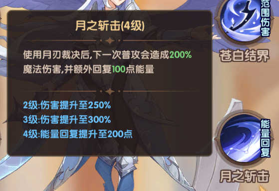 月之斩击:使用必杀技后,下次普通攻击造成300%伤害并能量回复提升200点,这个被动基本可以无限释放必杀技!